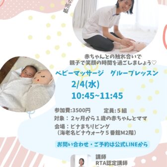 ベビーマッサージグループレッスンのお知らせ赤ちゃんとの毎日に何して過ごそうかな?誰か家族以外と話したいな私の育児ってあってる?など悩みを抱えている…
